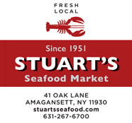 Stuart's Seafood Market is the locals' choice for the freshest fish, shellfish, lobsters, and gourmet provisions. Stuart's offers homemade soups, salads, appetizers, clambakes and lobster dinners to go as well as fresh produce, breads and desserts. Their specialties include traditional lobster rolls, lobster summer rolls, cedar planked salmon, seared tuna and key lime pies.